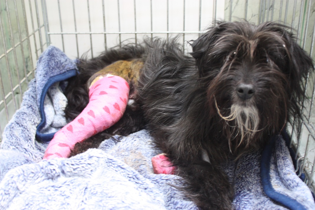 Łapek- pies po wypadku, pozostawiony na drodze ze złamanymi łapami
