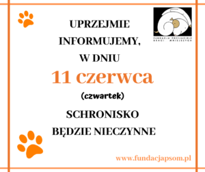 Strona główna•Informujemy, że w dniu 11 czerwca 2020r (czwartek) schronisko będzie zamknięte. Zapraszamy odwiedzających od piątku w godzinach 12.00 – 15.00.•www.fundacjapsom.pl(6)