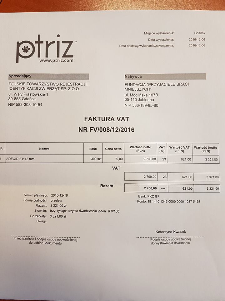 Wczoraj sprzedaliśmy kolejną partię nakrętek. Dostaliśmy za nie 1350 zł!!!!!! Całą kwotę przeznaczyliśmy na zakup czipów. Bardzo serdecznie dziękujemy za Waszą pomoc!