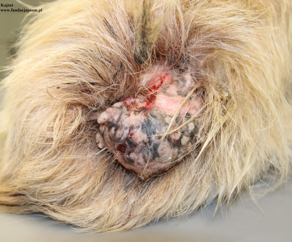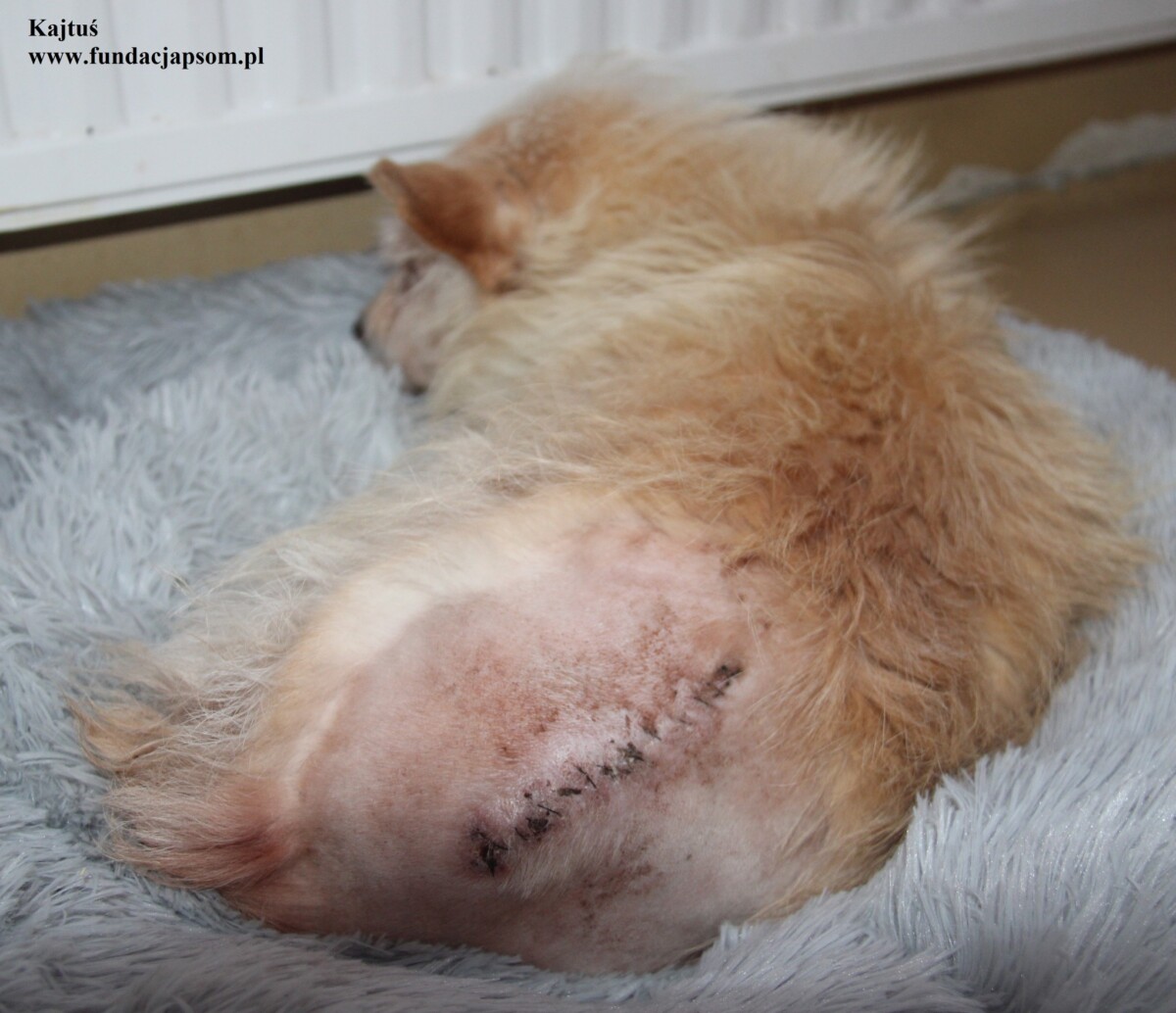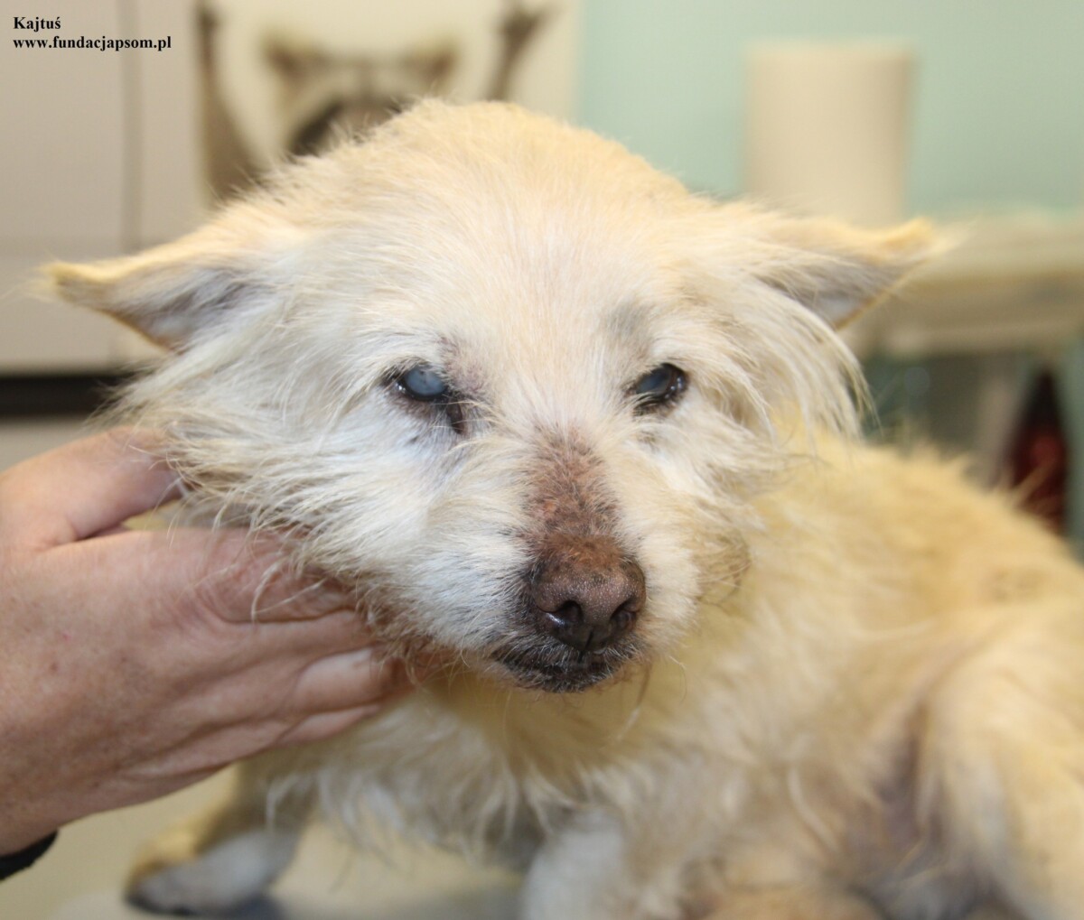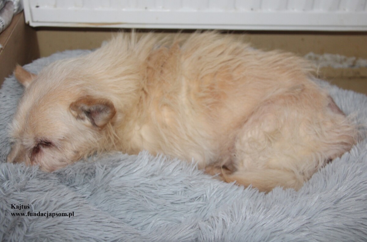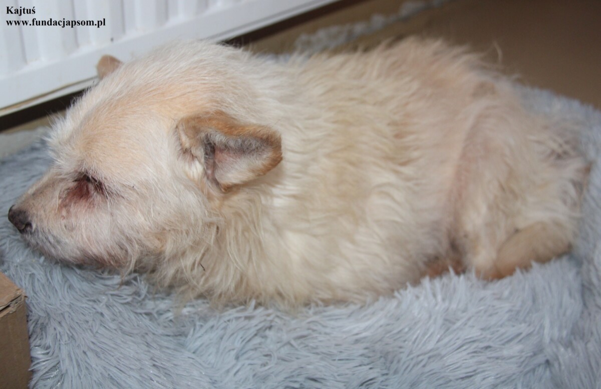 Kajtuś to około 10-letni piesek, który przybył do nas z terenu Długosiodło. Piesek przyjechał bardzo zmarznięty i wyziębiały. Pies ma zmętnienie soczewki prawego oka (zaćma), oraz guza u nasady ogona. Piesek przeszedł u nas zabieg kastracji, oraz zabieg usunięcia guza, który zakończył się pełnym sukcesem. Zakończyliśmy również antybiotykoterapię. Na dzień dzisiejszy Kajtuś czuję się dobrze i powolutku dochodzi do pełni sił.